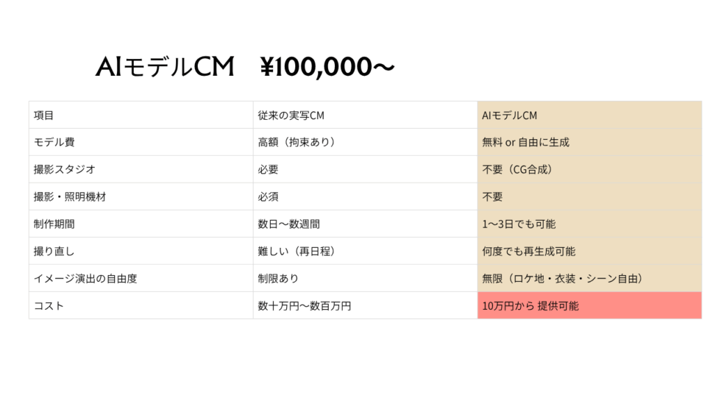 AIモデルCMにより、大手ハイブランド並みの表現が可能になります。