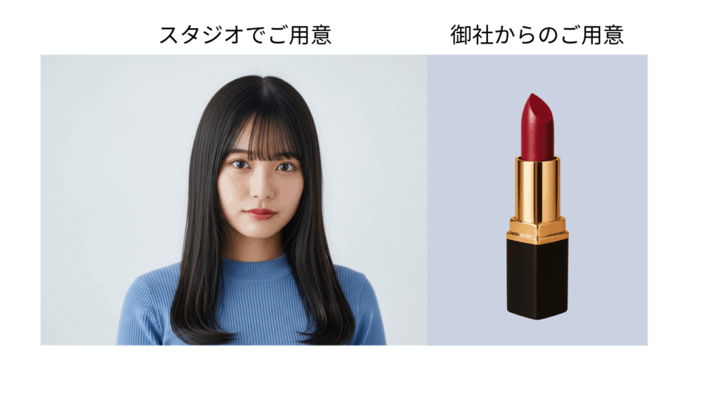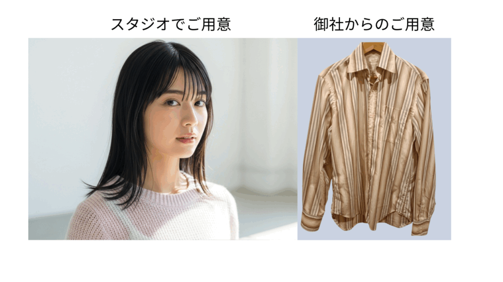 商品写真や御社ロゴなど今ある素材を最低1つお送りいただくだけで、あとは私たちとAIモデルにお任せいただけます。